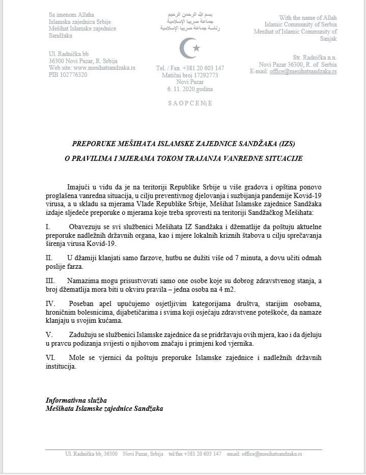 ImajuΔi u vidu da je na teritoriji Republike Srbije u viΕ‘e gradova i opΕ‘tina ponovo proglaΕ‘ena vanredna situacija, u cilju preventivnog djelovanja i suzbijanja pandemije Kovid-19 virusa, a u skladu sa mjerama Vlade Republike Srbije, MeΕ‘ihat Islamske zajednice SandΕΎaka izdaje sljedeΔe preporuke o mjerama koje treba sprovesti na teritoriji SandΕΎaΔkog MeΕ‘ihata:
