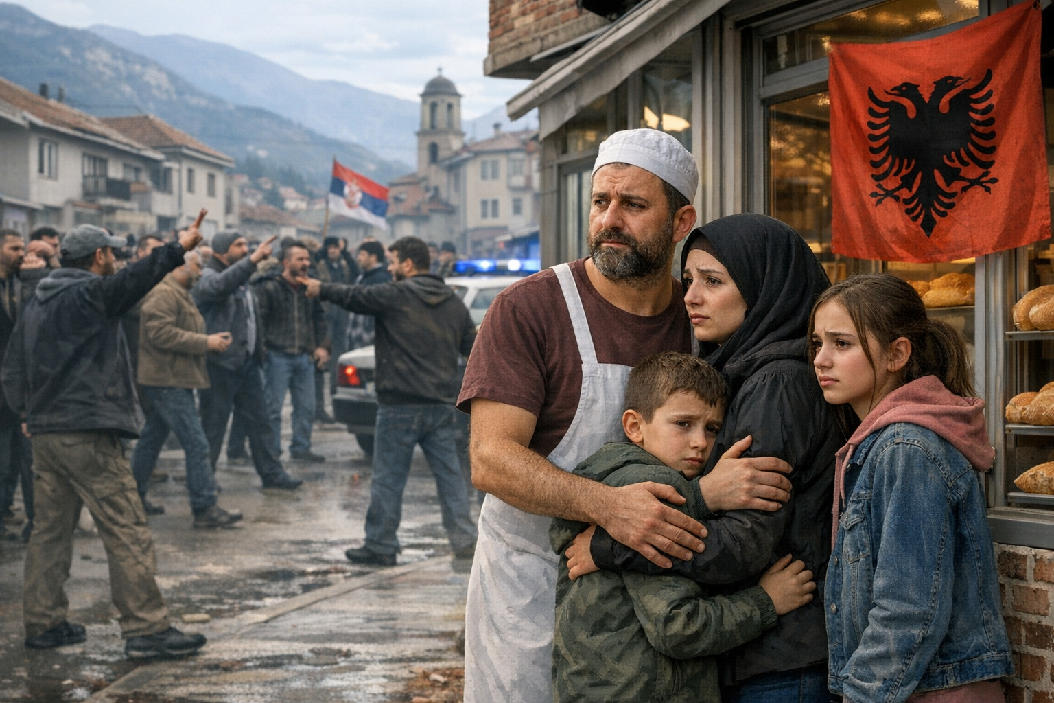 A mob in Surdulica, Serbia is targeting an innocent Albanian bakery owner, his wife, and their children day and night, after his young cousin was involved in an accident for which he has already been arrested.