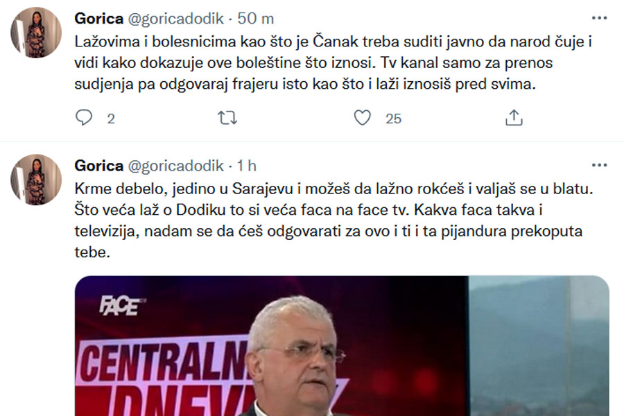 „Krme debelo, jedino u Sarajevu i možeš da lažno rokćeš i valjaš se u blatu. Što veća laž o Dodiku to si veća faca na Face tv. Kakva faca takva i televizija, nadam se da ćeš odgovarati za ovo i ti i ta pijandura prekoputa tebe“, poručila je odnedavno politički aktivna Gorica Dodik, te dodala: