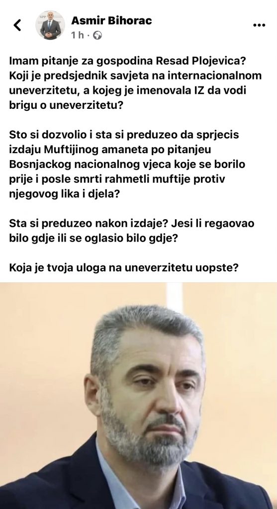 Visoki funkcioner SPP-a za dijasporu, gospodin Asmir Bihorac, putem svog Facebook profila postavio nekoliko oštrih pitanja Rešadu ef Plojoviću, koja prenosimo u cjelosti: