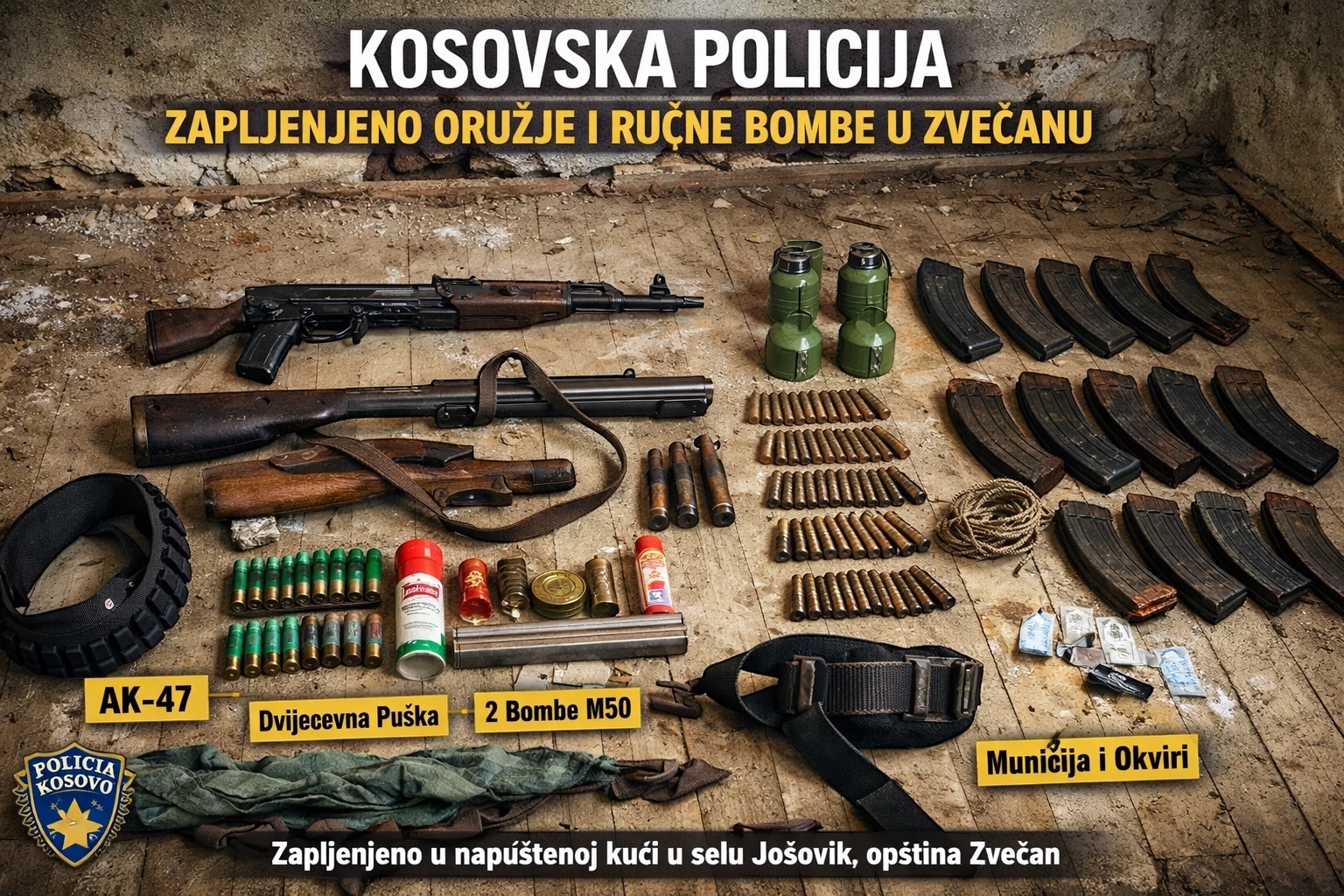 Zvečan – Kosovska policija saopćila je da je tokom pretresa jedne napuštene kuće u selu Jošovik, općina Zvečan, pronašla i zaplijenila veću količinu oružja, municije i eksplozivnih sredstava.