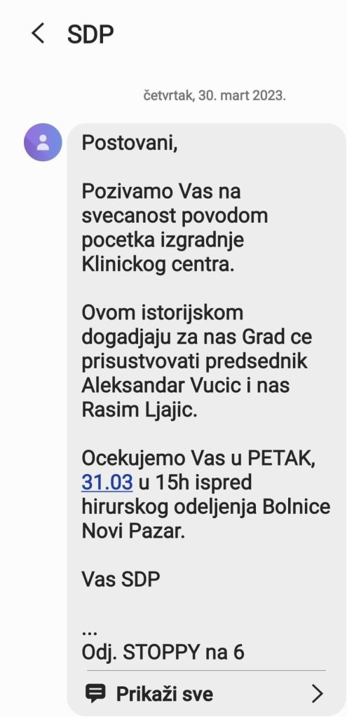 Međutim, i uprkos najavi polaganja kamena temeljca za izgradnju “Kliničkog centra” očito je da je to bila manipulacija kadrova Sandžačke demokratske partije, a sve u cilju postizanja jeftinih političkih poena, koju su osujetili građani Novog Pazara, pa je na jučerašnjem skupu pomenuta partija doživjela fijasko.