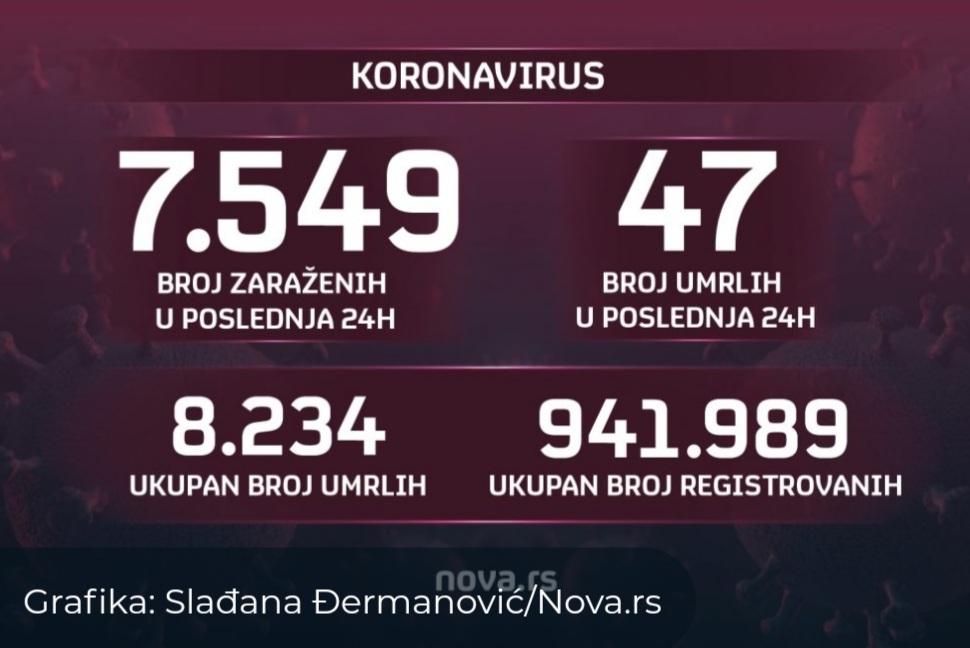 ***Srbija se nalazi na prvom mestu u Evropi, a na četvrtom u svetu, po broju novih slučajeva koronavirusa na milion stanovnika u poslednjih sedam dana, pokazuju najnoviji podaci sa sajta worldometers.info.Sa 5.509 novozaraženih na milion stanovnika, Srbija je pretekla Crnu Goru (4.976), iza koje slede Litvanija (3.783) i Velika Britanija (3.552). Među prvih deset zemalja po tom parametru našle su se još dve države sa prostora bivše SFRJ – Slovenija na osmom i Hrvatska na desetom mestu.