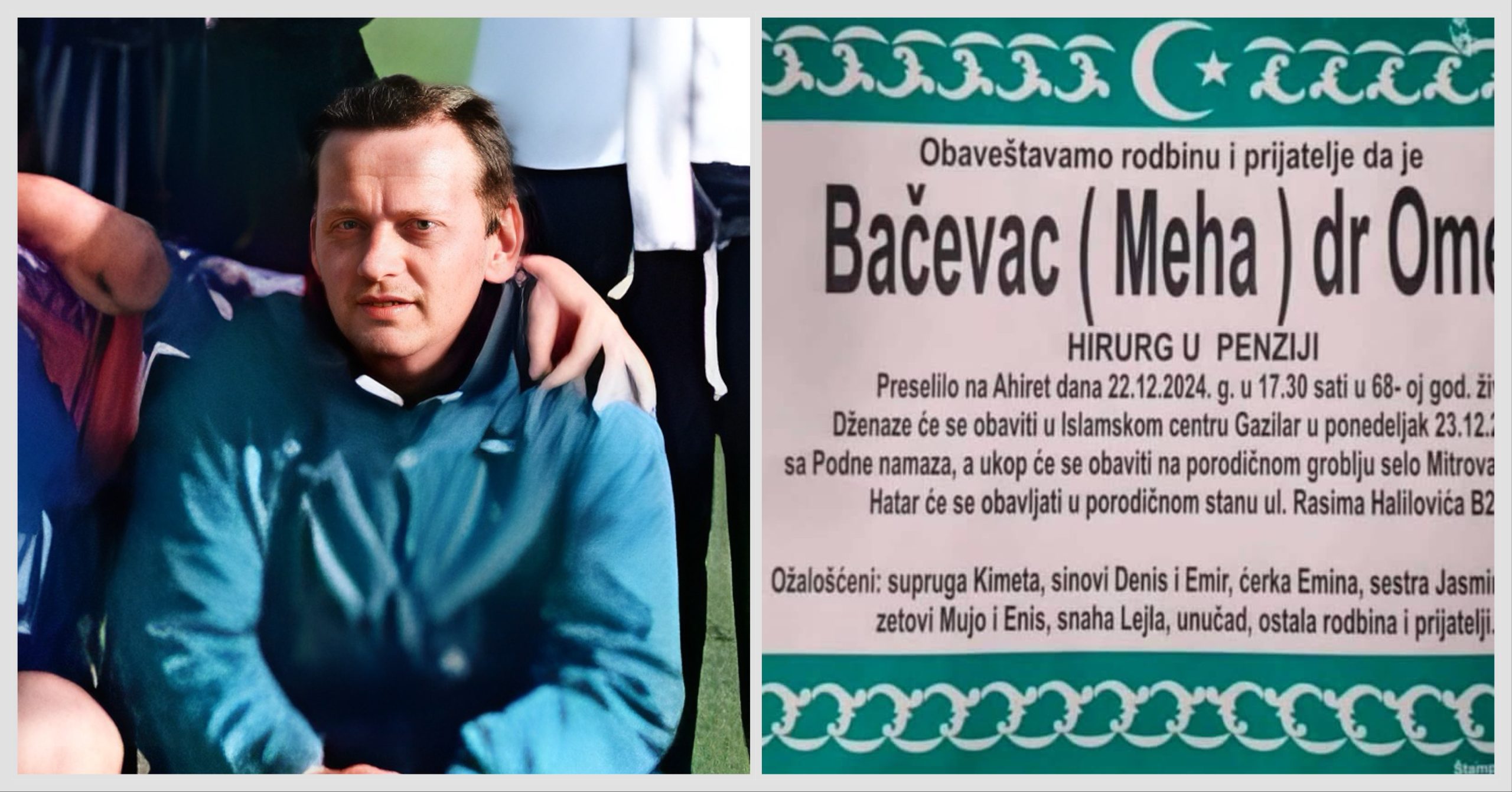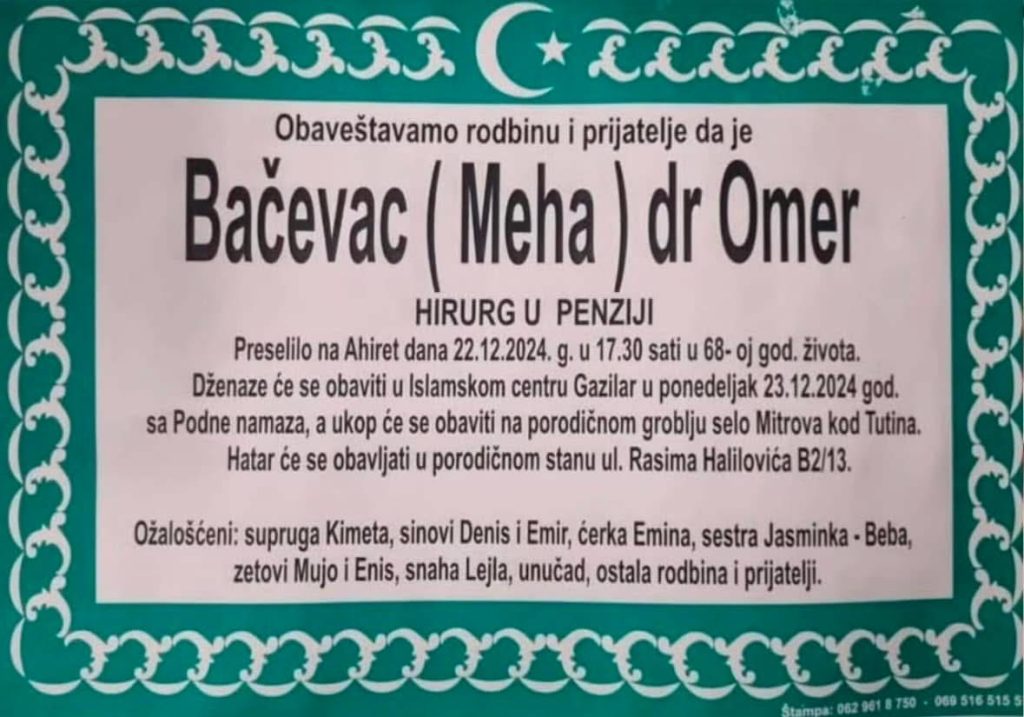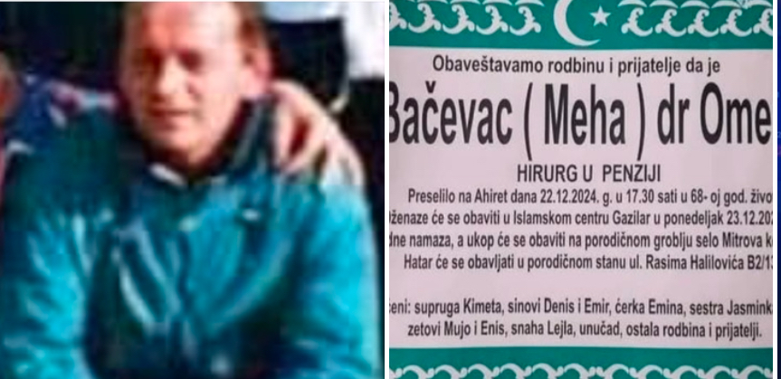 Dugogodišnji hirurg Opšte bolnice u Novom Pazaru, Omer Bačevac, preselio je na Ahiret. Njegova smrt predstavlja veliki gubitak za medicinsku zajednicu i sve one koji su ga poznavali i cijenili njegov rad. Bio je poznat po svojoj stručnosti, posvećenosti pacijentima i velikom doprinosu zdravstvenom sistemu.