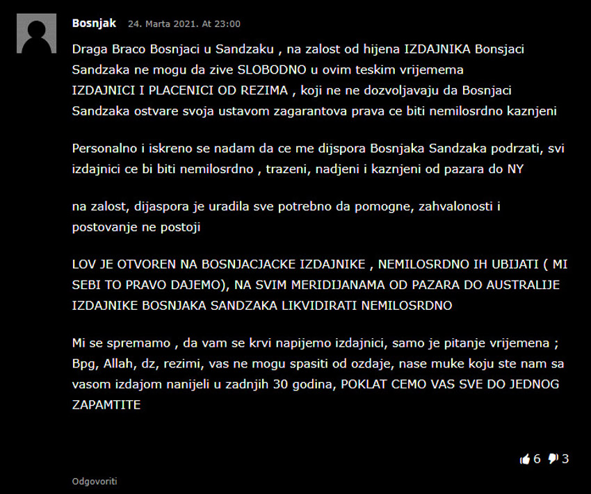 Komentar na divljem portalu sandzakpress.net koji nije bio uklonjen skoro 15 sati od momenta objavljivanja