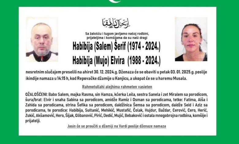 Bračni par Šerif i Elvir Habibija, iz mjesta Krušćica kod Konjica, preminuli su 30. decembra usljed trovanja ugljen monoksidom. Dženaza namaz ovom bračnom paru iz Konjica će se klanjati sutra poslije ikindije namaza u 14:15 sati, kod Repovačke džamije u Konjicu.
