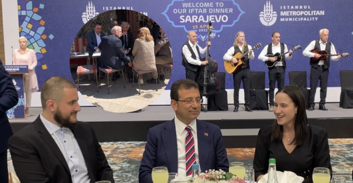 Naime, u ponedjeljak 26. 4. İmamoğlu je boravio u posjeti glavnom gradu Bosne i Hercegovine. Dočekala ga je gradonačelnica Sarajeva Benjamina Karić, s kojom je obišao i Baščaršiju. İmamoğlu je isti dan u Sarajevu organizirao i iftar. Ako se može nazvati iftarom. Više je izgledalo na kombinovanu proslavu i Uskrsa i Vaskrsa i Bajrama. Iftar je organiziran u hotelu s pet zvjezdica, a zvanice su bile domaći političari, predstavnici određenih firmi, načelnici i, što je najzanimljivije, strani ambasadori u Sarajevu. Za stolom s İmamoğluom sjedio je i britanski ambasador u Sarajevu Field, koji često posjećuje i Burch univerzitet, za koje turske vlasti naglašavaju da se radi o FETÖ obrazovnim ustanovama. Podsjećanja radi, kada je u Istanbulu bio kolaps zbog snijega, İmamoğlu je bio na večeri s britanskim ambasadorom u Turskoj.