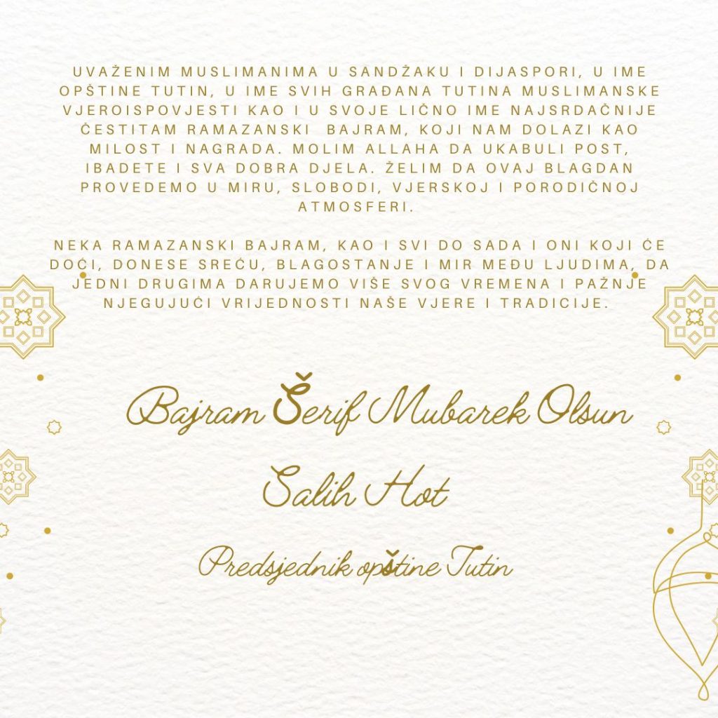 “Uvaženim muslimanima u Sandžaku i dijaspori, u ime opštine Tutin, u ime svih građana Tutina muslimanske vjeroispovjesti kao i u svoje lično ime najsrdačnije čestitam Ramazanski bajram, koji nam dolazi kao milost i nagrada. Molim Allaha da ukabuli post, ibadete i sva dobra djela. Želim da ovaj blagdan provedemo u miru, slobodi, vjerskoj i porodičnoj atmosferi.