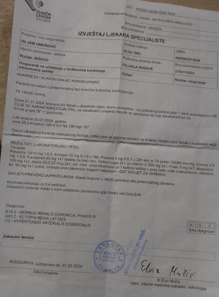 Rožajcu Isljamu Omeroviću, koji živi u selu Čokrlije, hitno je potrebna transplantacija bubrega za koju je potrebna izvjesna suma novca koju porodica Omerović ne može sama obezbijediti.