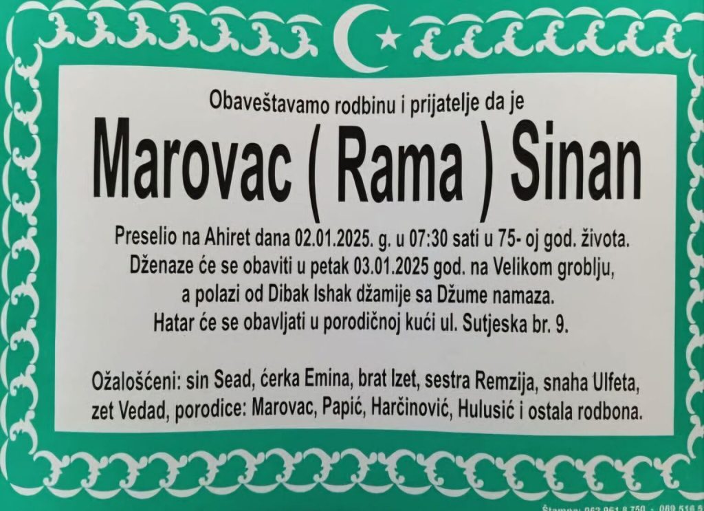 Dženaza dr. Sinana Marovca klanjat će se 3. januara 2025. godine nakon džume-namaza, a hatar će se primati u njegovoj porodičnoj kući.