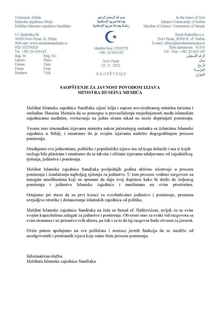 Mešihat Islamske zajednice Sandžaka cijeni želju i napore novoizabranog ministra turizma i omladine Huseina Memića da se pomogne u prevazilaženju razjedinjenosti među islamskim zajednicama, međutim, svrstavanje na jednu stranu nikad ne može doprinijeti pomirenju.