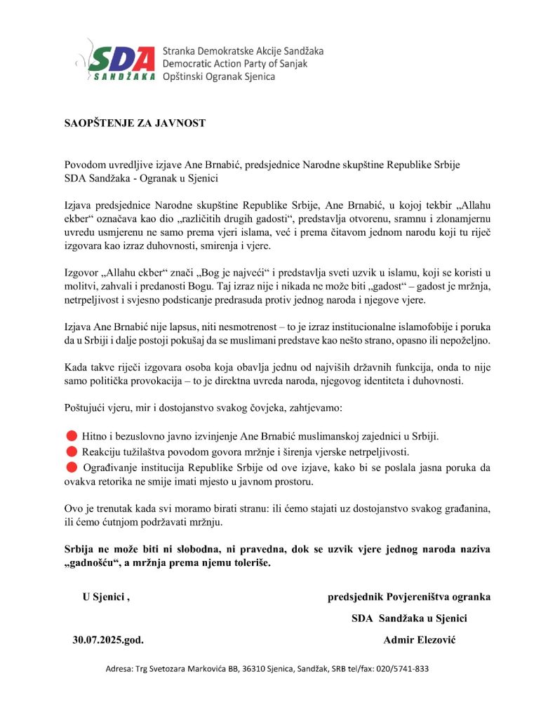 Sjenica, 30. juli 2025. — Ogranak Stranke demokratske akcije (SDA) Sandžaka u Sjenici izdao je saopštenje za javnost povodom izjave predsjednice Narodne skupštine Republike Srbije, Ane Brnabić, koja je izazvala ogorčenje u bošnjačkoj i muslimanskoj zajednici.