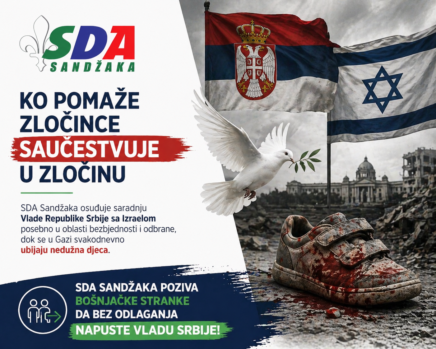 Na kraju, SDA Sandžaka upućuje poziv predstavnicima bošnjačkih stranaka koji učestvuju u radu Vlade Srbije da, kako navode, bez odlaganja napuste izvršnu vlast iz moralnih i političkih razloga.