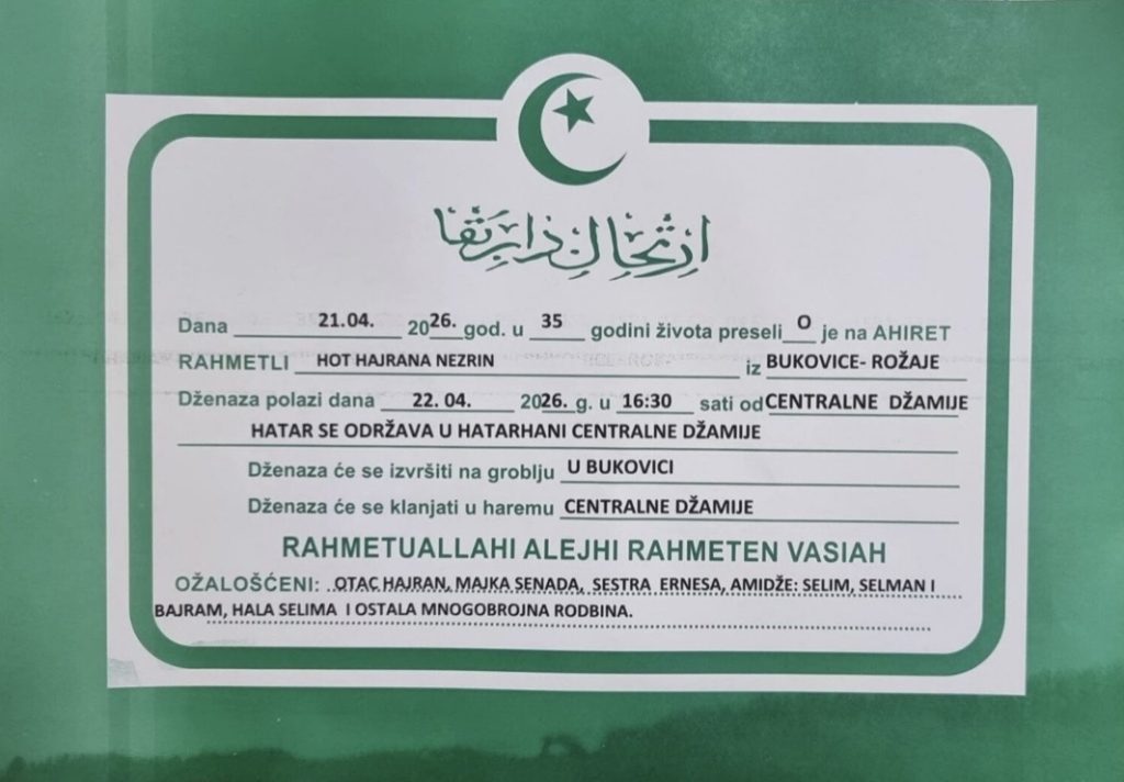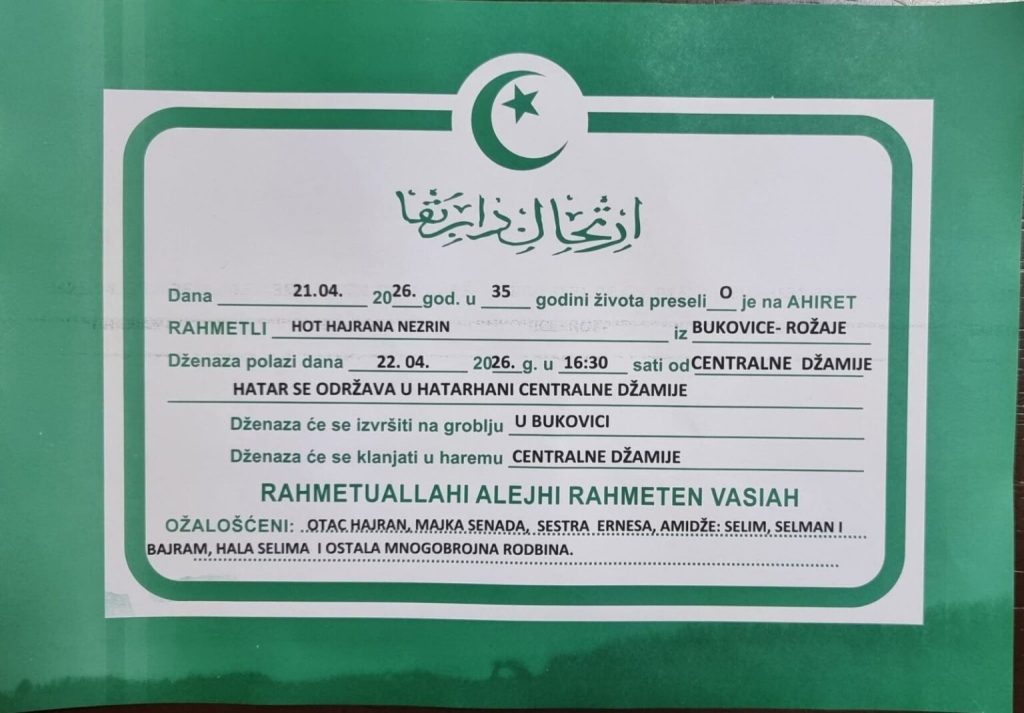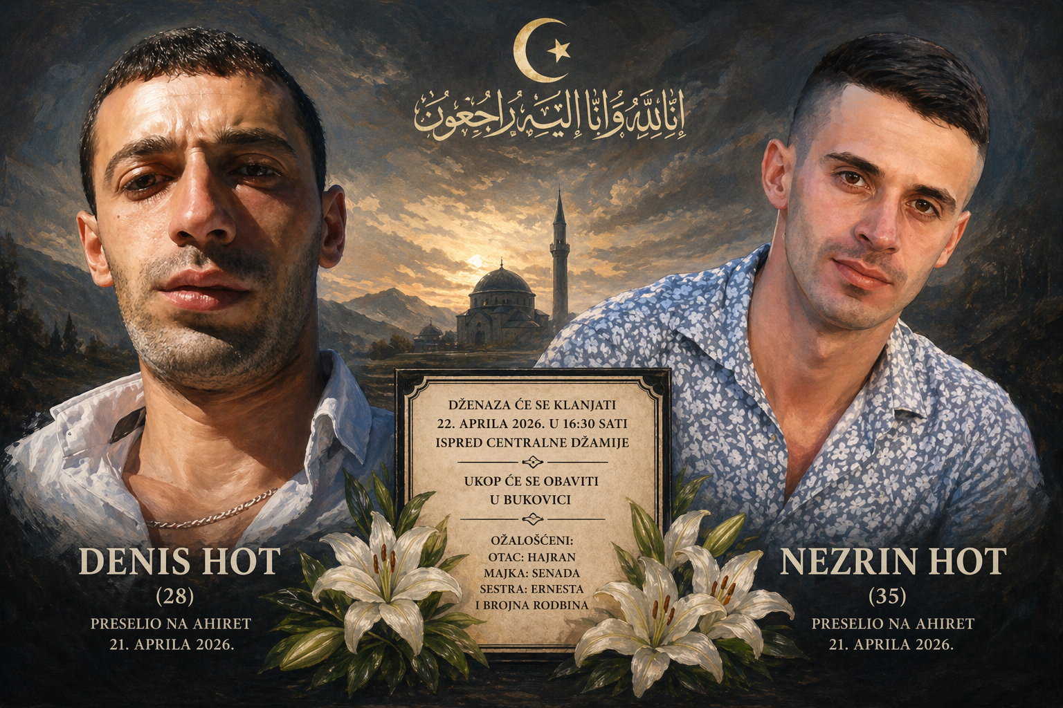 Rožaje je danas zavijeno u crno nakon što su objavljene smrtovnice braće Denisa (28) i Nezrina (35) Hota, čija je tragična smrt duboko potresla javnost i ostavila neizbrisiv trag tuge u njihovom rodnom gradu i šire.