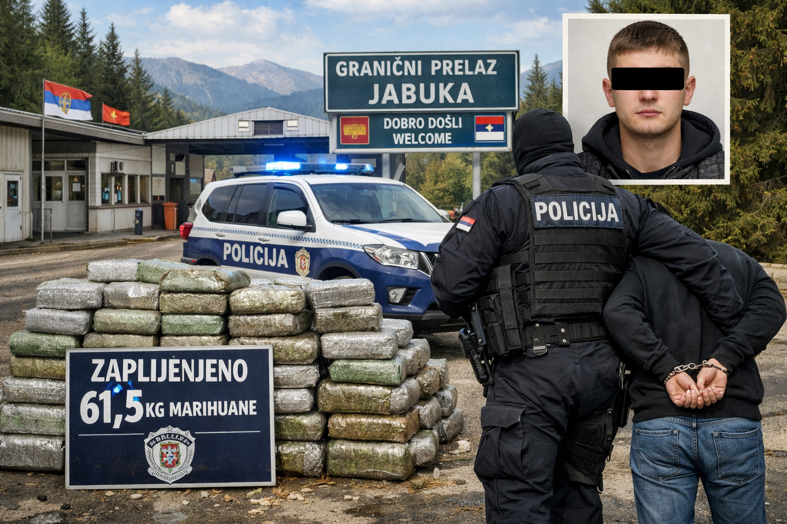PRIJEPOLJE / PLJEVLJA – Pripadnici Ministarstva unutrašnjih poslova Srbije, u saradnji s Upravom granične policije, zaplijenili su 61,5 kilograma marihuane na graničnom prelazu Jabuka, u blizini Prijepolja. Tom prilikom uhapšen je državljanin Crne Gore M. D. (1999), saopšteno je iz MUP-a.