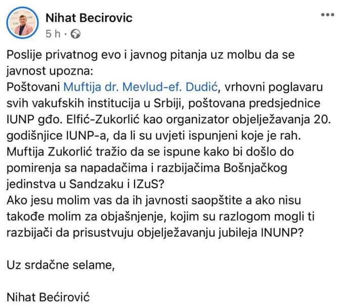 Nihad Bećirović daidžić rahmetli Muamera Zukorlića i funkcioner SPP-a, putem svog Facebook naloga javno prozvao Mevluda ef. Dudića i gospođu Elmu Elfić Zukorlić.