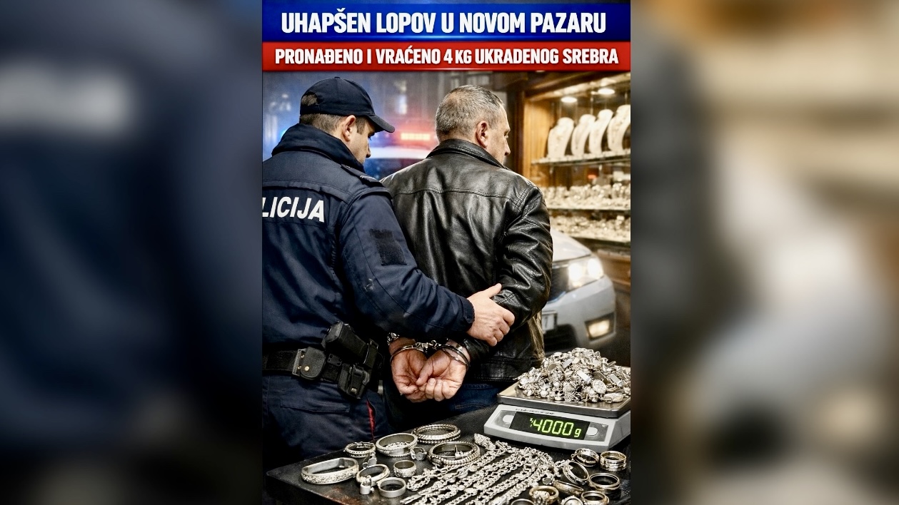 NOVI PAZAR – Brzom i efikasnom reakcijom pripadnika Policijske uprave Novi Pazar rasvijetljena je krađa koja je tokom novogodišnje noći uznemirila građane. Policija je uhapsila M. M. (1968), osumnjičenog da je iz zlatarske radnje u samom centru grada otuđio oko četiri kilograma srebrnog nakita.