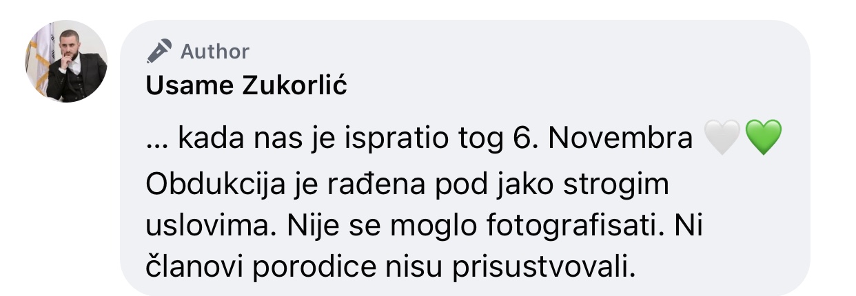 “… kada nas je ispratio tog 6. novembra. Obdukcija je rađena pod jako strogim uslovima. Nije se moglo fotografisati. Ni članovi porodice nisu prisustvovali” – napisao je Usame.