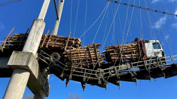 Viseća platforma nije mogla izdržati pritisak kamiona već na prvom segmentu vješanja. Kamion je za malo pao u vodu kada se most srušio ispod dvostruke pogonske osovine. Vozač je tada morao napustiti kabinu kako bi otišao na sigurno mjesto na djelomično uništenoj platformi, koja visi oko 30 metara iznad tla. Srećom, uspio se izvući bez ozljeda.