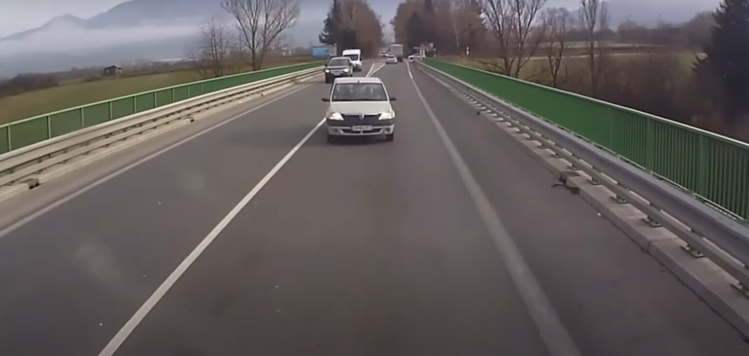 Na snimci se jasno vidi kako je vozač rumunjskog automobila skrenuo u suprotnu traku i krenuo prema kamionu. Svaki pokušaj izbjegavanja direktnog sudara ne bi uspio jer su ograde bile tik uz cestu, te je vozač kamiona pritisnuo kočnicu i naglo usporio. Na kraju je došlo do sudara. Vozač Dacie Logan ostao je zarobljen u kabini vlastitog vozila, i nije poznato kako je sve završilo.