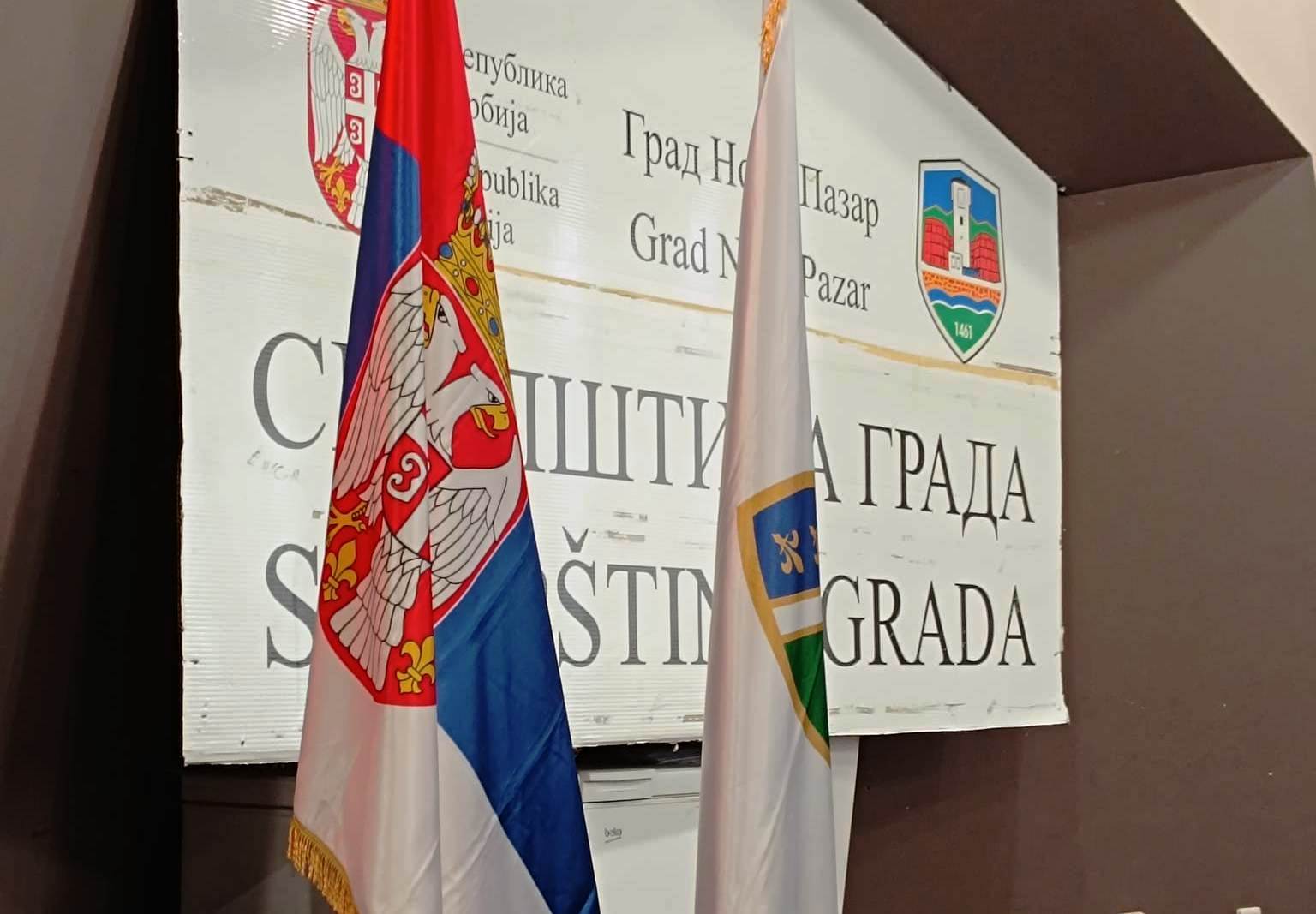 Početak sjednice Skupštine Grada Novog Pazara obilježila je nepravilno istaknuta nacionalna zastava Bošnjaka. Zastava koja se ističe zajedno sa državnom je postavljena na propisan način nakon što su protestujući zbog toga to zatražili odbornici SDA Sandžaka.
